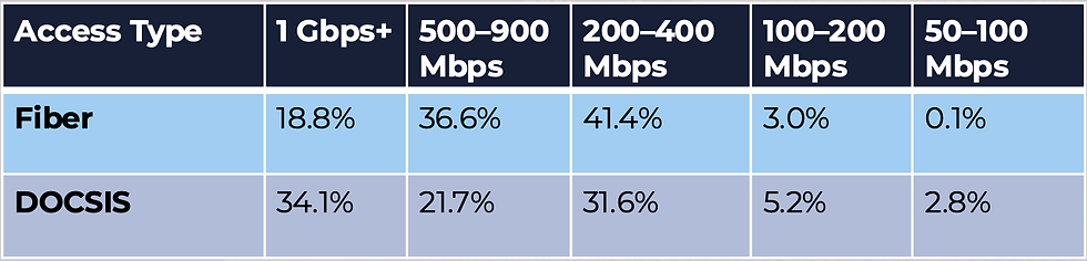On DOCSIS, 34.1% of subs are at 1 Gbps+, with fewer in those mid‑range tiers than on fiber.